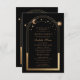 Célestial Black Dourado QR Code Quinceañera Invices apresenta um elegante sol dourado, lua e estrelas com ouro em fundo preto. Dentro é a sua informação de convite da Quinceañera. No verso, adicione informações adicionais, como o site da Quinceañera e o código QR. Personalize editando o texto nas caixas de texto. Projetado para você pelo Evco Studio www.zazzle.com/store/evcostudio