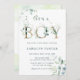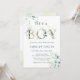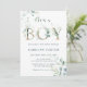 É um convite de chá de fraldas para meninos que pintou o eucalipto com aquarela, folhas verdes com letras botânicas de ouro e um código QR no verso. Para personalização mais avançada deste design, clique no BOTÃO FERRAMENTA DESIGN AZUL para alterar a fonte, o tamanho, a cor, etc.