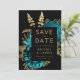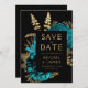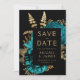 Este elegante e melancólico casamento "Salve o cartão da data" apresenta um buquê floral romântico e luxuoso em turquesa com folha de ouro e folhagem brilhante num fundo negro. Personalize o texto dourado em fontes na moda em um retângulo preto. Adicione um breve texto adicional ao fundo preto sólido, juntamente com um código QR para guiar os seus convidados ao seu website de casamento.