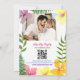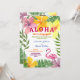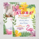 Convide os convidados com um estilo tropical usando este convite de festa de compromisso luau com flores de hibisco em negrito, folhas de palmeira e um flamingo divertido. O design duplo inclui um código QR para confirmação de presença, site do casamento e uma foto do casal - tornando-o divertido, funcional e pessoalmente lindo. Ideal para celebrações na praia, quintal ou destino.