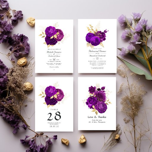 Convite de casamento floral roxo e dourado personalizável para suas especificidades de evento. Ideal para qualquer tema ou casamento de jardim. O código QR no verso direciona para o seu local de casamento onde o pessoas pode aprender mais e rsvp.