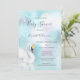 Princesa elegante do cisne num lago de turquesa com reflexo do cisne na água. Elegante convite para chá de fraldas de inverno com grandes flocos de neve. Com um código qr digitalizável na parte de trás para o registro de presentes do convidado de honra.