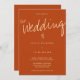 Um convite de casamento com um design de tipografia casual, mas moderno, e um código QR para o RSVP. Este convite de cor sólida laranja queimada acentua o grande evento com a palavra Casamento em uma fonte grande, estilo de escrita manual. O resto do convite é em tipografia limpa, aberta, que dá ao design uma estrutura forte. Este convite reflete a natureza relaxada, mas bem organizada, do seu casamento. Pronto para verificar convites fora da sua lista? Basta adicionar suas informações e o código QR, adicionar este convite ao seu carrinho e fazer um casamento de excelente. Código QR Tipografia Casual Queimada Laranja Invitação Feriado Design | ©Melissa Patton - Designer