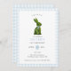 Convite de aniversário infantil fofo e elegante com coelhinho de topiaria pintado à mão com borda de gingham azul e branco.