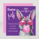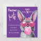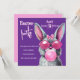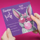 Lindo Coelho de Páscoa cinza vestindo um laço rosa entre as orelhas e óculos de sol rosa estilosos com uma bolha de chiclete. Colocado em um fundo roxo neste convite de festa de Páscoa totalmente personalizável. Adicione os detalhes da sua festa para amigos, vizinhos e todos os convidados. O verso do convite da festa é um rosa delicado.