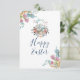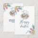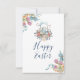 Cartão de Feliz Páscoa. Projetado com uma ilustração criada com aquarelas. Uma adorável mamãe coelha vestida de azul sentada em um cesto rodeada por ovos. Borboletas e flores ao redor do cesto. Ramos florais de tulipas nos cantos.