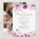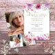 Um convite de celebração da vida personalizado com aquarela floral elegante e lembrança de funeral com uma colagem de 3 fotos no verso. Criado por Thisisnotme©