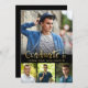 Convite para festa de formatura moderno com uma colagem de fotos de quatro fotos na frente com um título de FORMANDO de traçado de pincel de ouro na frente e uma FESTA de pincel de ouro nas costas com seus detalhes de convite para festa de formatura. ALTERAÇÕES: Altere a cor preta do fundo e/ou altere o estilo, o tamanho, a cor ou o posicionamento da fonte de texto no EDIT. ASSISTÊNCIA: para obter ajuda com a modificação ou personalização do design, a alteração de cor ou a transferência do design, entre em contato com o designer ANTES DE ENCOMENDAR através da guia MENSAGEM de Bate-papo Zazzle ou envie um e-mail para makeitaboutyoustore@gmail.com.