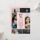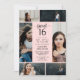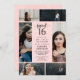 O convite para 16 fotos com colagem de fotos com espaço para seis fotos de sua aniversariante. Adicione o texto do convite e os detalhes em fontes pretas contra um fundo rosado. A parte traseira apresenta um impressão cor-de-rosa com um efeito aquarela esmaecido.