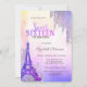 Um moderno, chic e glamouroso Sweet 16 com gotas de brilho, e torre Eiffel de diamantes em um fundo metálico.