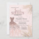 Vestido elegante de ouro rosa, e pampas em fundo rosa.