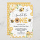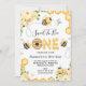 Colmeia Floral Tão Doce Para Ser Um primeiro aniversario Convidando o macho ou o convite para o aniversário da abelha Doce com quatro abelhas bonitinhas, alguns arranjos florais, corações e colmeias. É tão doce ser um convite primeiro aniversario que também tem um pente de mel.