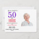 This vibrant “50 & Fabulous” design features bold purple and red typography paired with a cheerful portrait illustration for a bright, uplifting look. The colorful striped back pattern adds a fun, festive touch, creating a lively invitation perfect for celebrating a milestone birthday. A stylish blend of elegance and playfulness for joyful celebrations.