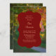 A photograph of a vibrant maple tree standing in a forest clearing. The tree’s leaves are transitioning from bright green to fiery shades of red, orange, and yellow, catching the golden light of the late afternoon sun. A gently winding path, covered with fallen leaves, leads into the background of the image, lined with blurred silhouettes of other trees. Soft sunlight filters through the canopy, creating dappled shadows on the forest floor.