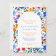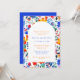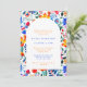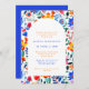 Um chá de panela colorido do tema da festa de verão. Este convite apresenta uma arca branca sobre uma grande fatia de flores vibrantes do estilo folk mexicano em azul, laranja e rosa. Personalize com seus detalhes. O reverso está em azul elétrico sólido.