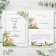 A tropical themed wedding invitation with colorful tropical greenery and florals.
