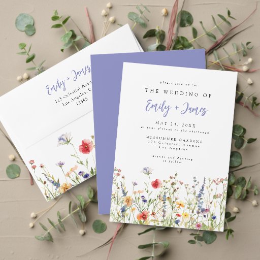 This wildflower wedding collection is inspired by the beauty of a blooming summer garden. Hand-painted florals in soft, lively colors rise naturally along the design, creating a fresh and organic feel. Clean, classic typography balances the playful blooms for a look that feels both elegant and inviting. Ideal for outdoor, garden, or countryside celebrations.