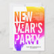 Colorida coloração aquática artística de Ano Novo. Este convite moderno mostra uma escova colorida de aquarela em amarelo, laranja, rosa e roxo com o texto "Partido de Ano Novo". O verso é coberto por um padrão do texto "Feliz ano novo", com fundo colorido.