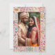 Um cartão de salvar data alegre e colorido com padrões tradicionais indianos coloridos que certamente irá chamar a atenção. No verso, a foto do casal.