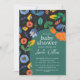 Design de chá de fraldas moderno com flores grandes e coloridas em amarelo alaranjado e azul com um arco moderno mostrando suas informações sobre o partido.