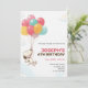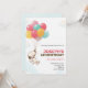 A birthday invitation featuring a cartoon dog being lifted by colorful balloons. Text reads "Joseph's 6th Birthday" with the event details below. The tone is cheerful and playful.