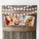 Um convite triplo de 2 em 1 país rústico com festa de formatura de campo apresentando um fundo de barril de madeira rústico, luzes de cordas cintilantes, girassóis amarelos brilhantes, fotos do formando, o ano de aula, detalhes de celebração da graduação e um cartão postal rsvp para seus convidados cortarem e enviarem de volta.