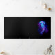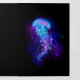 Água-viva grande, azul, desenhada artisticamente, brilhante, brilhante, com longos tentáculos sobre fundo preto com bioluminescência roxa. Água-viva luminosa.
