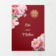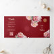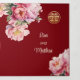 Este elegante convite bilíngue para o casamento chinês mostra peônias de aquarela e um símbolo de dupla felicidade dourada num fundo vermelho escuro. Nomes de noiva e noivo em um elegante roteiro escrito à mão. Convite para casamento chinês ou convite para cerimônia de chá. Com sua foto no centro do triplo convite para casamento e um texto tradicional chinês no lado interno direito. Na parte de trás estão os detalhes e um código qr digitalizável para o seu site de casamento.