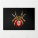 Aranha mecânica, com pá-pá de ouro, engrenagens de latão e uma lâmpada de vidro vermelha sobre fundo preto. Estilo Steampunk.