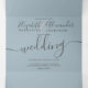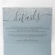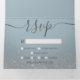 O convite para casamento de chic com o guião azul empoeirado de Silver glitter ombre empoeirado com detalhes, convite principal e o rsvp para o seu convidado cortar e voltar. Adicione sua foto atrás. Apresentando uma luz cinzenta prateada de cinza em um fundo simples azul com uma letra elegante e moderna de caligrafia.