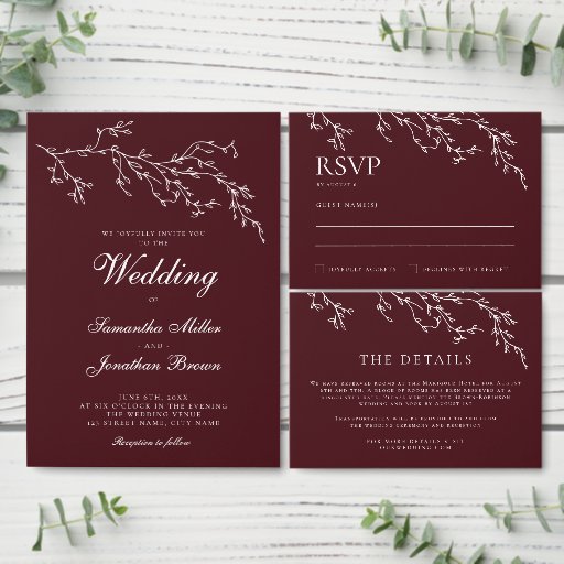 Convite Com Dobra Tripla Burgundy & Ivory Botanical Elegant Wedding