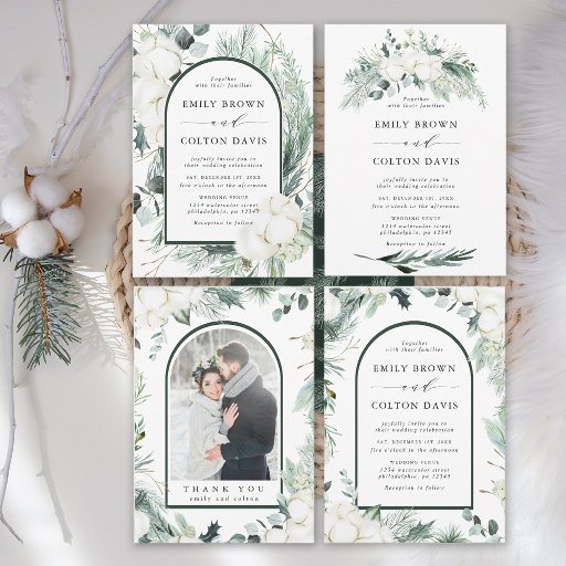 Tudo isso em uma tripla carta de convite de casamento contém verde-inverno pintado à mão, flores de algodão com texturas de ouro e aquarela, detalhes de casamento, rsvp e sua foto. Para personalização mais avançada deste design, clique no link "personalizar mais". Itens correspondentes também estão disponíveis.