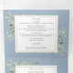 Convite de casamento triplo tudo-em-um com folhas de verde botânico em aquarela elegante em um fundo azul empoeirado, uma moldura dourada chique e sua foto especial. O convite inclui detalhes de informações da celebração e um cartão de RSVP. Projetado por Thisisnotme