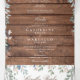 Um convite de casamento triplo elegante e completo com sua foto especial, iniciais monograma e uma cascata de folhagem floral de flores silvestres que envolve os detalhes do seu casamento em um fundo de painéis de madeira de celeiro rústico. O convite inclui detalhes da informação dos convidados para a celebração e um cartão RSVP destacável. Criado por Thisisnotme©