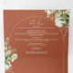 Tudo em um convite de casamento de terracotta triplo com um arco de ouro cômico, folhas botânicas verdes e sua foto especial. O convite inclui os detalhes de informações de seus convidados de celebração e um cartão RSVP destacável. Projetado por Thisnotme©