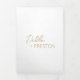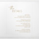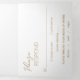 Um convite de casamento de ouro falso moderno, com um design simples e mínimo com o nome da noiva em um roteiro elegante e o nome do noivo em uma fonte de sans serif contemporânea. Abaixo, no canto inferior direito, estão os detalhes do evento em um layout minimalista. O painel do meio tem sua foto favorita, o painel direito é sua placa RSVP e a parte traseira tem seus detalhes adicionais.