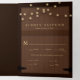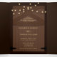 A Dourada caligrafia rustica da madeira do celeiro Elegante Convocação Tripla é a combinação perfeita de charme de eterno e elegância sofisticada. Design com um pano de fundo ilustrado, esse convite expele um sentimento quente e rústico, reforçado pela caligrafia dourada (efeito digital, não folha real!) que graciosamente enfeita o cobrir e os florescimentos. Cordas de luzes adicionam um brilho quente ao marrom-escuro do fundo. A design tripla permite espaço amplo para todos os detalhes do casamento, incluindo uma seção RSVP e informações adicionais sobre eventos, tudo maravilhosamente organizado em um layout coeso e na moda. Ideal para casais que buscam um convite de casamento que reflita tanto seu amor pela natureza quanto seu desejo de elegância refinada, este convite dá o tom para uma celebração verdadeiramente memorável.