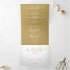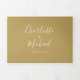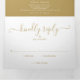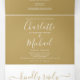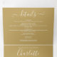 Convite de casamento tri-fold tudo-em-um com tipografia branca elegante em um fundo dourado e sua foto especial. O convite inclui detalhes de informações para os convidados da celebração e um cartão RSVP destacável. Projetado por Thisisnotme©