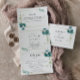 Este convite de casamento geométrico de verde tropical de ouro é perfeito para um casamento rústico. O design apresenta predominantemente folhagem verde-aquosa pintada manualmente, acoplada a flores douradas, enfeitando uma elegante moldura geométrica.
