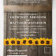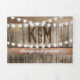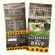 Um convite de casamento trifold rústico 3 em 1 com fundo de barril de madeira rústica, luzes cintilantes, girassóis amarelos brilhantes, seu monograma, detalhes do casamento, convite de casamento e um cartão postal de rsvp para os convidados destacarem e enviarem de volta.