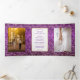 Convites personalizáveis para casamento em três-bandas, com duas fotos, com remendos roxos e dourados.