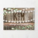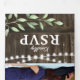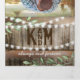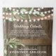 Um convite de casamento rustico country chic 3 em 1 trifold com fundo de barril de madeira rústica, luzes cintilantes, folhagem botânica em aquarela, seu monograma, detalhes do casamento, convite de casamento e um cartão de resposta RSVP para os convidados destacarem e enviarem de volta.