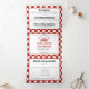 Convites de casamento elegantes tudo em um. Envie todo o cartão com todas as informações, informações de recepção e cartão de resposta postal, eles podem destacar e enviar de volta para você. O design apresenta um padrão xadrez vermelho e branco de piquenique na praia e um caranguejo de xilogravura vermelho.