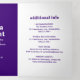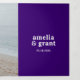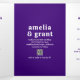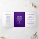 Convites de casamento trifold em estilo moderno, apresentando um layout simples e minimalista com seus nomes em uma fonte retrô groovy. Abaixo estão os detalhes do seu evento em uma fonte sans serif, juntamente com seu código QR (opcional) para que os convidados o leiam e respondam facilmente online. O painel esquerdo tem seu cronograma de eventos, o painel direito tem detalhes adicionais e o verso tem sua foto favorita. A paleta de cores brilhantes é na vibrante tonalidade de roxo real. O código QR pode ser removido e as fontes / cores podem ser alteradas na ferramenta de edição de design.