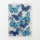 Composição vertical de borboletas de morfo realistas, azuis e brancas sobre fundo texturizado de cinzas. Borboleta azul Morpho.