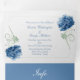 Adorável convite de casamento triplo feito em um papel gráfico branco texturizado, com gráficos bonito de flores azuis de hydrangea. Um fundo azul, na seção do meio do convite, adiciona um bom contraste. Personalize o texto para atender às suas necessidades de casamento. Os produtos correspondentes estão disponíveis.