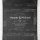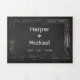 Um convite para casamento de chalkboard russo triplo, com um quadro imitado por giz com um olhar feito à mão. O cartão de resposta é um recorte de cartão postal, com opções de refeições e com o endereço de retorno pré-impresso. O convite também inclui informações detalhadas sobre o casamento.