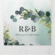 Tudo em um triplo convite de casamento botânico verde apresentando uma cor d'água rústica desbotada lavada em pano de fundo, elegantes folhas azuis de eucalipto, pedaços de folha de ouro falsa, suas iniciais, detalhes do casamento, convite e um cartão postal rsvp para seus convidados cortarem e enviarem de volta.