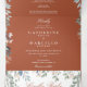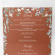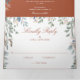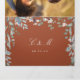 Um convite de casamento tri-fold elegante tudo em um com sua foto especial, iniciais monograma e uma cascata de folhagem floral de flores silvestres envolvendo os detalhes do seu casamento em um fundo de terracota. O convite inclui detalhes das informações dos convidados para a celebração e um cartão RSVP destacável. Criado por Thisisnotme