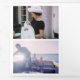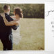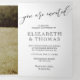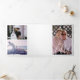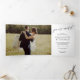 Convite de aniversário de casamento elegante trifold com uma foto do casal na capa com cinquenta em sobreposição de caligrafia branca. Adicione outra foto no interior junto com a redação do convite de celebração de aniversário. Adicione mais duas fotos no verso.